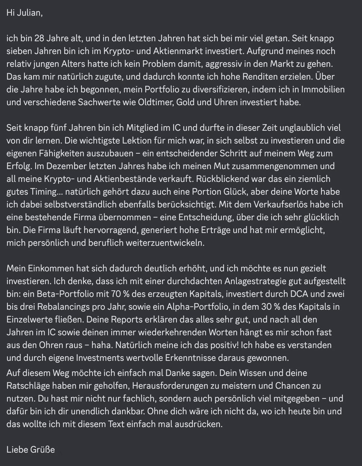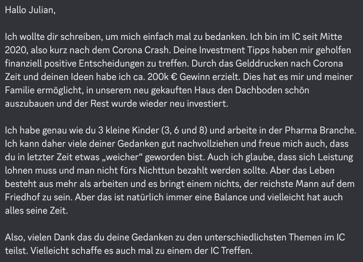“Immer mehr Erfolgsgeschichten erreichen mich, bei denen Inner Circle Mitglieder mir für ihre neue finanzielle Unabhängigkeit danken. Mit dem richtig angewandten Wissen konnten sie gute Entscheidungen treffen – genau das erfüllt mich mit Stolz und treibt mich an, täglich mein Bestes zu geben!”