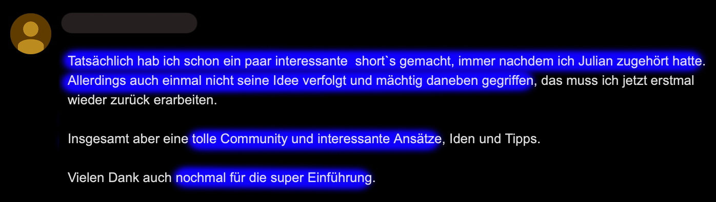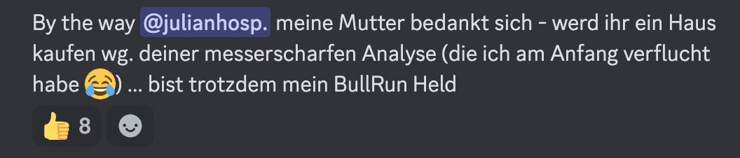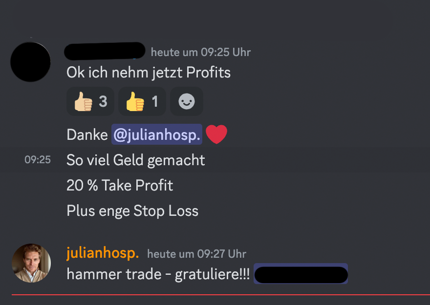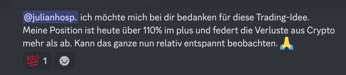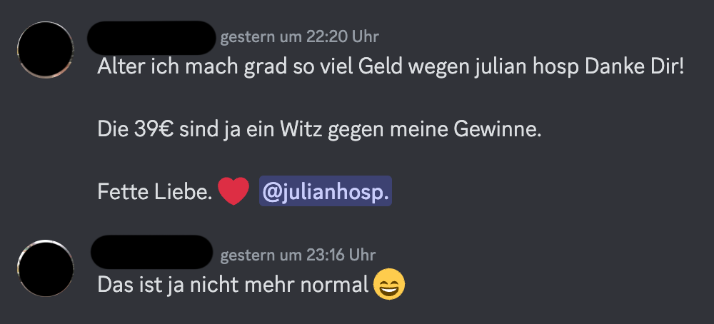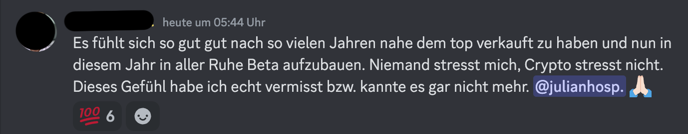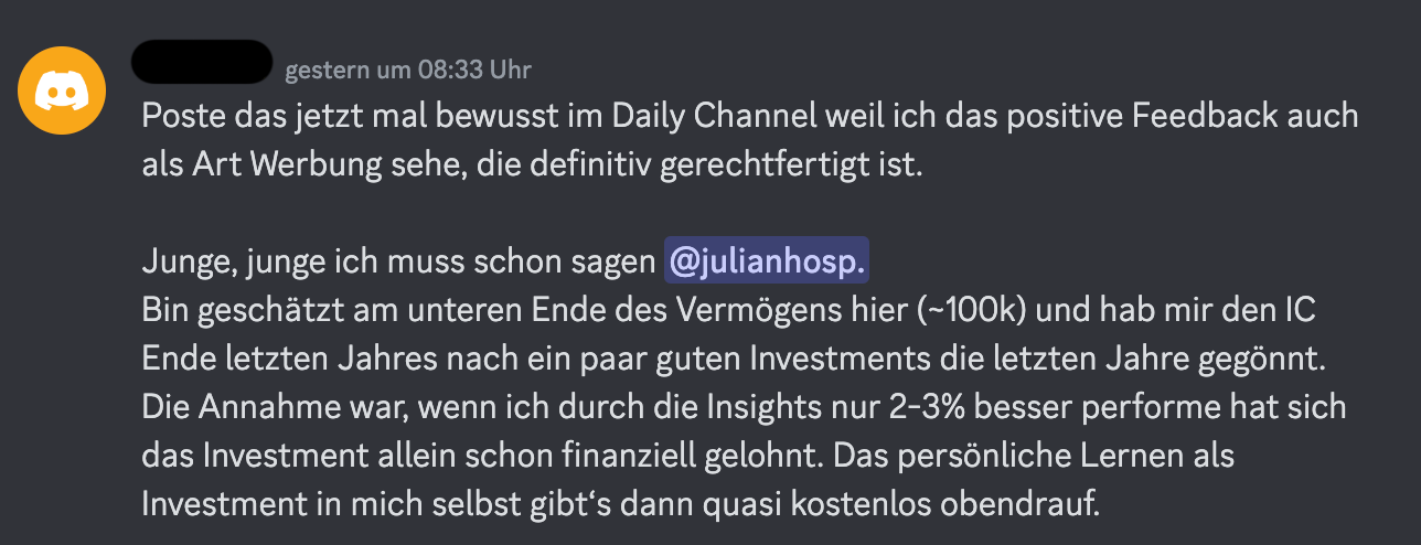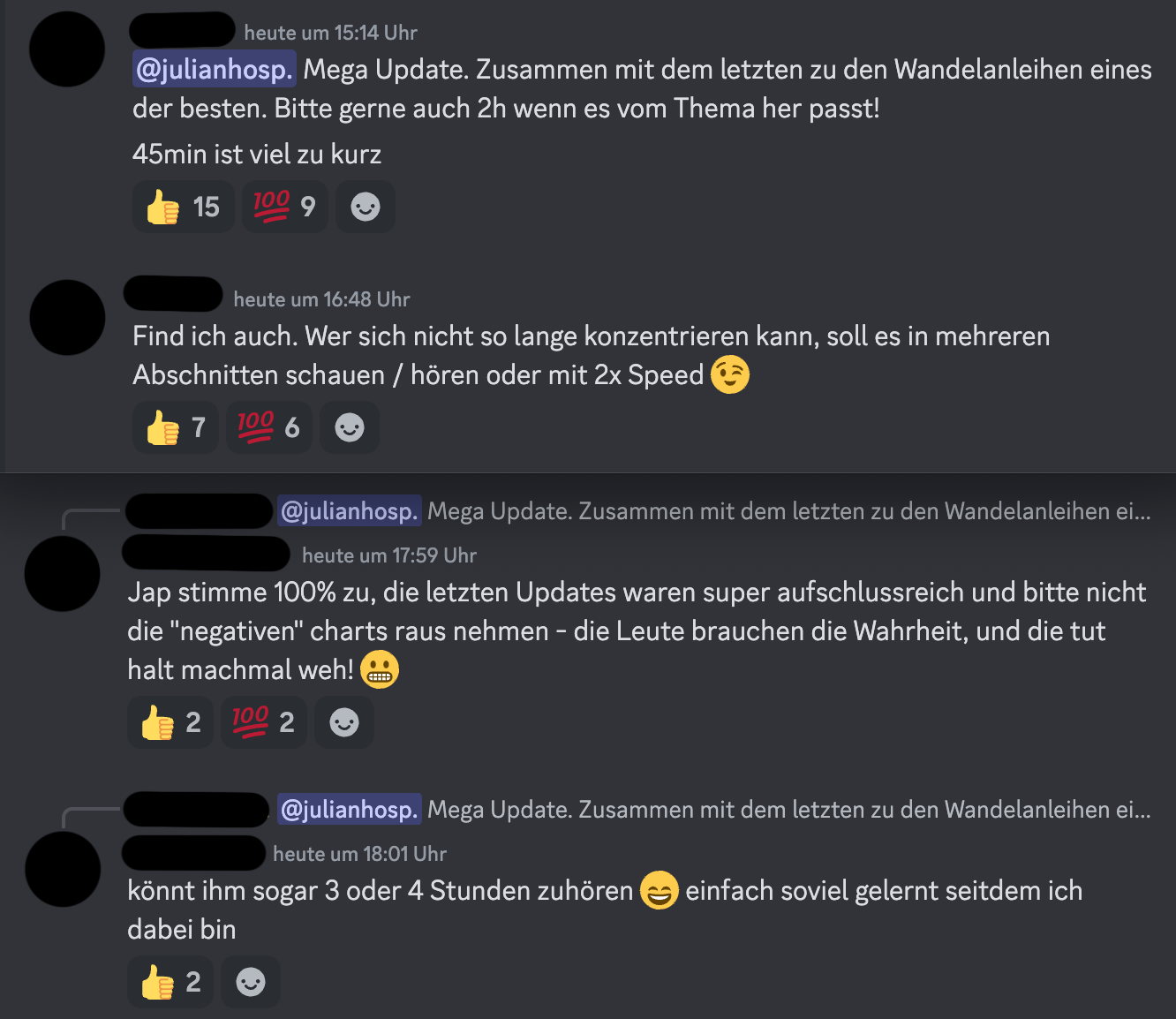 Im Community Discord gibt es über 30 verschiedene Channels zu den wichtigsten Themen im Leben eines jeden Investors. Julian selbst interagiert mit Dir als Mitglied, antwortet regelmäßig und liefert entscheidende Tipps in allen Lebenslagen. Zusätzlich hast Du den einen direkten Draht zu Julian per DM.